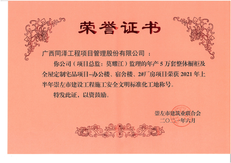 年產5萬套整體櫥柜及全屋定制宅品二期項目榮獲2021年崇左市安全文明工地
